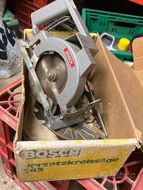 Sega combinata circolare con disco da taglio da 130 mm; guida per tagli diritti, dado adattatore esagonale per fissare la sega all'albero (maschio) del mandrino del trapani, che deve avere il collare da 43mm. Può essere regolata in modo appropriato per eseguire tagli a 45º o a qualsiasi grado e profondità necessari. Parecchie parti di ricambio provenienti da analiga macchina che mi era caduta e si era rotta la fusione