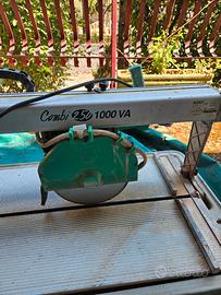 Segatrice ad acqua con motore scorrevole. Compressiva di disco Ø 250 mm, puntatore laser, goniometro, vasca in plastica antiurto, cavalletto con due ruote in gomma, piano di taglio aggiuntivo salvavita. Perfettamente funzionante e ben conservato.