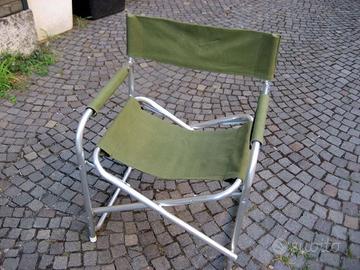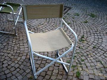 Cedo due seggiole tipo regista ,la prima in alluminio e tela ( Colore verde e seduta rifatta sfoderabile ) ; la seconda in acciaio verniciato e seduta in materiale sintetico traspirante di colore sabbia ; materiale in ottime condizioni