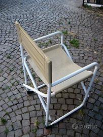 Cedo due seggiole tipo regista ,la prima in alluminio e tela ( Colore verde e seduta rifatta sfoderabile ) ; la seconda in acciaio verniciato e seduta in materiale sintetico traspirante di colore sabbia ; materiale in ottime condizioni