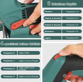 Il seghetto elettrico HYCHIKA ha un motore da 800 W e 6 velocità regolabili, con una corsa di taglio di 22 mm. La profondità massima di taglio è 110 mm per il legno e 10 mm per il metallo. Offre 4 tracce regolabili e un angolo di taglio da -45° a 45°. È dotato di guida laser per tagli precisi e di una guida parallela per controllare la larghezza del taglio. Include 6 lame intercambiabili, un sistema di raccolta della polvere e un cavo di alimentazione di 3 metri. Nella confezione sono inclusi il seghetto, lame, un righello di guida e un manuale.