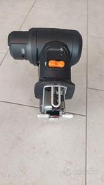 Batteria agli ioni di litio – Nr. 4 lame (per legno, acciaio, pvc, plastica) – Compatibile con lame attacco universale 1/2" per seghetto alternativo – Cambio lama rapido senza attrezzi, In modalità "seghetto alternativo" lama con movimento orbitale e oscillatorio, soffiatore detriti, luce a led per migliorare la visibilità durante il taglio, Testina di taglio orientabile di 90° per trasformare il seghetto a gattuccio in seghetto alternativo