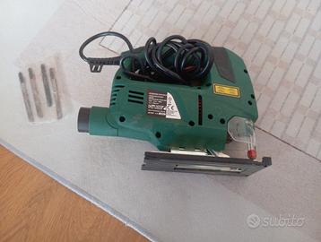 Seghetto elettrico a pendolo Parkside con laser di precisione, corredato di 4 lame di varie dimensioni, libretto istruzioni e confezione originale.