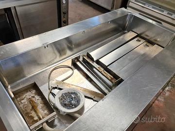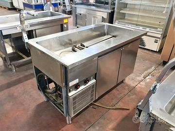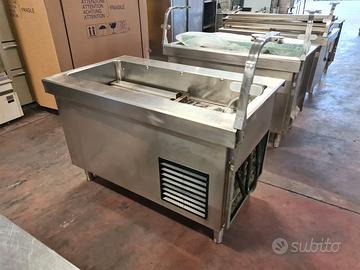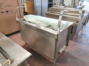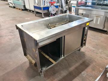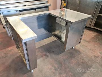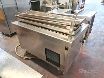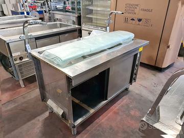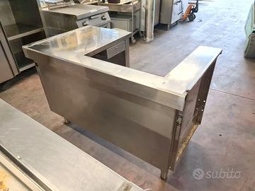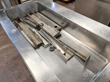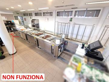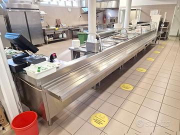 self-service per mensa usato, si tratta di un bancone self-service caldo e freddo più cassa e carrello: vassoi, stoviglie, tovagliette, pane, etc. in acciaio inossidabile con una lunghezza totale di 710X81cm completi di vetri para sternuti (smontati).