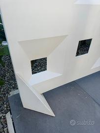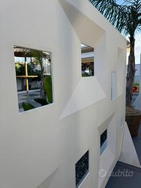 Frames Myyour è un separatore per spazi estrerni oppure utilizzabile come recinzione o rivestimento di una parete. La forma è caratterizzata da superfici svasate che fanno da cornice a piccole finestre. Questo prodotto può essere posizionato anche verticalmente con l'ausilio dell'accessorio zavorra. Realizzato interamente in polietilene Poleasy, un materiale che ha come scopo di eliminare le microporosità superficiali che causano patine antiestetiche nel corso del tempo. Inoltre, questo tipo di polietilene garantisce superfici più compatte, durevoli e facili da pulire.