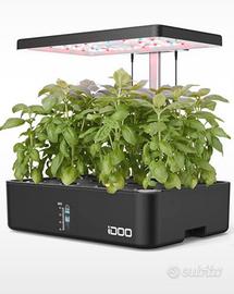 Sistema idroponico indoor con luci LED per la coltivazione di erbe aromatiche e ortaggi.