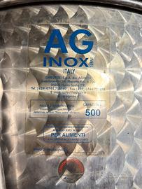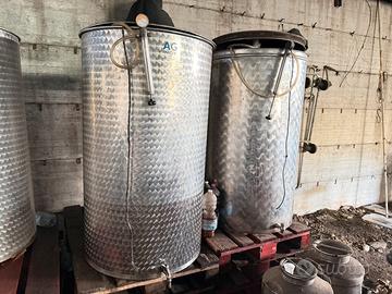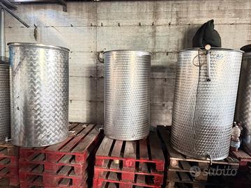 Si vendono 5 serbatoi in acciaio inox per uso alimentare, specificamente per la fermentazione e lo stoccaggio del vino. Capacita 500 lt Produttore: I serbatoi sono di marca AG Inox. Materiale: Costruiti in acciaio inossidabile di alta qualità, resistente alla corrosione. Funzionalità: Dotati di galleggiante ad aria per prevenire l'ossidazione del liquido contenuto. Accessori: Inclusi rubinetti per lo scarico, pompe per il galleggiante e manometri per il controllo della pressione. Il prezzo 500 euro tutti e 5 Si vendono anche singolarmente 100’ euro cadauno