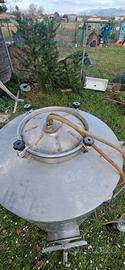 contenitore per vino o olio a fondo conico è realizzato in acciaio inox e completo di piedistallo, con apertura e sfiato sulla parte superiore e un apertura sul laterale basso con rubinetto, il prodotto ha circa 20 anni ma tenuto in buone condizioni come si evince dalle foto .