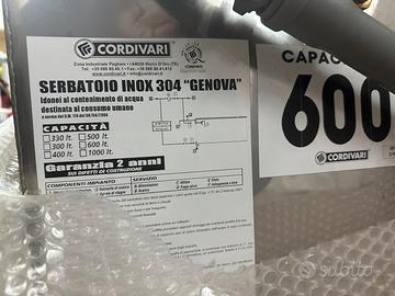 Vasca per stoccaggio acqua potabile 600 lt acciaio inox 304 in condizioni perfette marca Cordivari modello Genova completa di coperchio.