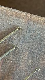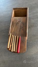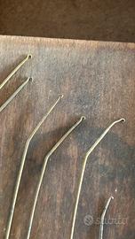 SERIE DI 6 ATTREZZINI A UNCINO USATI , PER TESSITURA SU TELAI , VINTAGE , CON SCATOLA IN LEGNO, LUNGHEZZA 24 CENTIMETRI