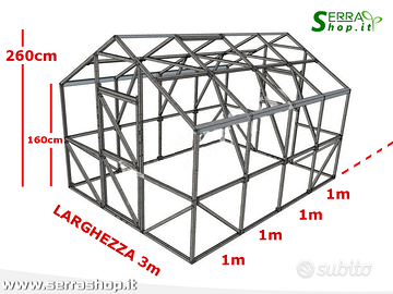 Serrashop presenta una serra a casetta davvero speciale , un articolo esclusivo adatto per l'utenza professionale ma anche per il privato. Le nostre serre sono adatte per orto , giardino , terreno agricolo e per una vasta tipologia di ortaggi e verdure oltre che a piante e fiori di ogni genere. I nostri clienti sono : agricoltori , vivai , agriturismi , cooperative agricole , consorzi e naturalmente privati che desiderano iniziare o continuare una sana coltivazione biologica. La nostra azienda mette a disposizione centinaia di tipologie di serra , da quelle con copertura in policarbonato ( il migliore e il più pesante in commercio ) a FILM professionale di prima qualità a rete antigrandine e teli ombreggianti. Inoltre tantissimi accessori. Tutto disponibile e scontabile sul nostro sito serrashop_it. Offriamo anche: -Servizio ricambi -Consegna in tutta ITALIA -SERVIZIO ASSISTENZA -Pagamento alla consegna/bonifico In questo annuncio proponiamo : Serra OASI DATI TECNICI STRUTTURA : profili arcate acciaio zincato 40x40mm ARCATE: distanti 1m COPERTURA : Policarbonato pesante 4mm di 800g/mq ( disponibile versione 6mm 1300g) APERTURE : N° 2 porte con doppia anta e finestre per ventilazione. CARICO NEVE : 180kg MISURE Larghezza : 3m Altezza : 2,6m Lunghezza : minimo 4m espandibile di 2m in 2m Porta : 80xH180cm Maggiori dettagli e specifiche tecniche su nostro sito. Sul nostro sito potrai trovare altri modelli e misure per tutte le tue necessità. SPEDIZIONE Possiamo spedire in tutta Italia con un piccolo contributo spese. PAGAMENTI Bonifico Contrassegno INFORMAZIONI Per qualsiasi informazione il nostro staff è a completa disposizione, chiama contattaci tramite il nostro sito o tramite email. Visita il nostro sito , troverai centinaia di articoli per le tue necessità.
