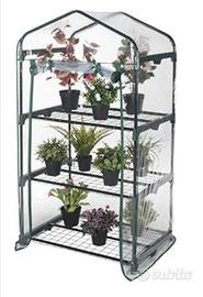 VENDO SERRA DA BALCONE O GIARDINO A 4 RIPIANI E TELO TRASPARENTE CON 2 CERNIERE DI CHIUSURA. DOTATA DI RUOTE PER UN AGEVOLE SPOSTAMENTO.