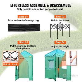 · Porta & Finestra Arrotolabile: due porte con cerniera arrotolabile possono essere aperte completamente per un facile accesso. Le finestre a rete avvolgibili per un'eccellente ventilazione e a prova di uccelli. Un cinturino in velcro sulla tenda della finestra può mantenere la serra completamente chiusa in caso di maltempo.
