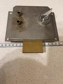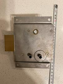 Serratura utilizzabile con pomello. Chiavi non presenti o forse neppure previste. Utile per chiusure dall’interno. Tre mandate. Meccanismo fluido.