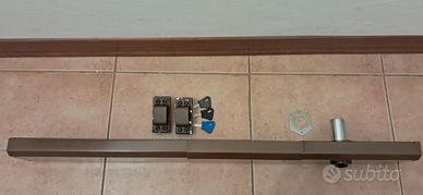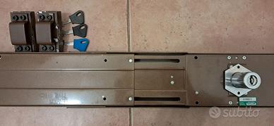Serratura di sicurezza Mottura a spranga orizzontale. Larghezza regolabile tra 80 e 90 cm, barra interna in acciaio estensibile, cilindro passante a pompa con calotta interna per chiave, fornita con 3 chiavi, 2 supporti per cerniere di chiusura, placca esterna Mottura e viti di montaggio. Peso totale 5.5 kg.