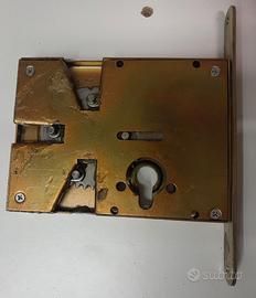 Serratura Quadruplice Destra a spinta per portone Legno ad incasso. Distanza da bordo serratura a centro cilindro 6,5 cm.Completa usata INTROVABILE. Fornisco serratura a 4 punti di chiusura alto, basso, centrale sinistra, e centrale destra con i suoi 4 rostri , le sue 3 aste che si possono modificare di misura, i suoi 3 riscontri, placca interna per copertura meccanismi, e 2 bocchette interno ed esterno per cilindro , il cilindro in foto serve solo per campione per nuovo acquisto. Spedizione o ritiro su Grosseto.
