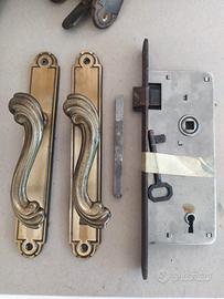 lotto di sei maniglie in ottone complete di serratura, sono da interno, interasse 90 mm. sono tutte funzionanti.