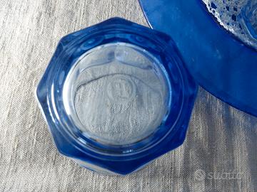 vendo 6 bicchieri in vetro azzurro robusti, h. 10cm.,base 7 cm.diametro, bocca 9 cm.diametro. più piatto vetro blu robusto diametro32 cm.h.2 cm.con centrino in cotone bianco fatto all'uncinetto 21 cm.diametro. ideale per party in giardino stile vintage