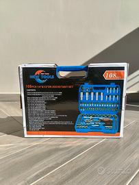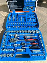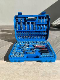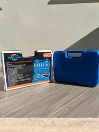 Kit di chiavi a bussola a cricchetto cromo La confezione contiene: 18 bussole attacco 1/2 (dalla 10 alla 32mm) · 8 bussole attacco 1/2 con impronta torx ( E10,E11,E12,E14,E16,E18,E20,E24) · 13 bussole attacco 1/4 ( dalla 4 alla 14mm) · 5 bussole attacco 1/4 con imrponta torx (E4,E5,E6,E7,E8) · 13 bussole lunghe ( dalla 6 alla 22) · 12 cacciaviti esagonali ( da 3mm a 14mm) · 6 cacciaviti fissi (da 4 mm a 12mm) · 8 cacciaviti a croce · 10 cacciaviti francesi (da T 8 a T55) · 2 chiavi x candela(16mm,21mm) · 2 snodi(1/4,1/2) · 4 prolunghe(1/4,1/2) · 1 cacciavite · 2 cricchetti (1/2,1/4) · 1 attacco giraviti x cricchetto · 2 leve