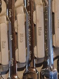 Set 12 chiavi combinate a cricchetto articolato. Cricchetto con 72 denti particolarmente scorrevole, orientabile fino a 180 gradi, in cromo-vanadio, Larghezza delle chiavi da 8 a 19 mm. Come nuovo. Disponibile al ritiro a Milano.