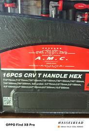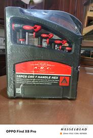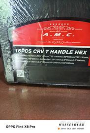 Set di 16 chiavi esagonali a T a torx in acciaio CRV AMC. - T10*75mm, T15*75mm, T20*100mm, T25*100mm, T30*150mm, T40*150mm, T45*200mm, T50*200mm - Misure metriche: 2.0*75mm, 2.5*75mm, 3.0*100mm, 4.0*100mm, 5.0*150mm, 6.0*150mm, 8.0*200mm, 10.0*200mm - Design tedesco