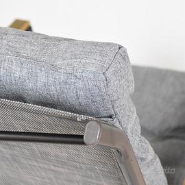 La sua struttura robusta in acciaio e i cuscini imbottiti rivestiti in morbido poliestere grigio garantiscono comfort e resistenza alle intemperie.