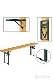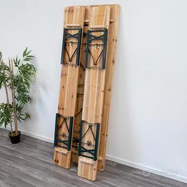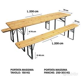 Set 3 Pezzi Birreria con Tavolo Pieghevole e Panche da Esterno, Struttura in Acciaio Comoda, Seduta Ergonomica e Resistente, Ideale per Giardino, Bar, Campeggio, Sagra. Pratico set composto da tavolo pieghevole e due panche, ideale per giardino, terrazzo, eventi, feste e sagre. Il design classico in legno e ferro richiama lo stile delle tradizionali birrerie, unendo estetica rustica e funzionalità. Il piano del tavolo e le sedute sono realizzati in legno di abete resistente, con spessore tavole di 20 mm per il tavolo e 23-25 mm per le panche, garantendo solidità e lunga durata. La struttura portante è realizzata in ferro verniciato a spruzzo, progettata per garantire elevata stabilità e resistenza nel tempo. Il telaio pieghevole permette di sostenere il peso in modo sicuro durante l’utilizzo e allo stesso tempo garantisce una struttura robusta, ideale sia per uso domestico che per eventi e utilizzi intensivi. Grazie al sistema pieghevole rapido, tavolo e panche possono essere chiusi facilmente per essere trasportati o riposti quando non utilizzati. Questa caratteristica rende il set estremamente pratico per giardini, campeggio, mercatini, sagre, picnic o catering, permettendo di ottimizzare lo spazio e di montare l’area pranzo in pochi secondi. Perfetto per manifestazioni all'aperto, funzionale negli spazi ricreativi e divertente in un giardino durante feste tra amici, il tavolo birreria con 2 panche restituisce il piacere della convivialità fatta di piccole cose genuine. Pratico e facile da riporre non richiede alcuna manutenzione. Dimensioni tavolo: Cm 200x70 Dimensioni panca: Cm 200x25x46h Peso prodotto 34Kg. Portata struttura; Tavolo: Massimo 150 kg. Panche: Massimo 250-300 Dimensioni imballo 12 X 201 X 71 cm. Disponibile ritiro presso il nostro shop Frattamaggiore via Lupoli, 26/28 Spedizione in tutta italia tramite corriere Sda express 24/48h a partire da €19,99 Consegna a domicilio, pagamento al corriere al costo di €14,99 Info whastapp al 3662769492