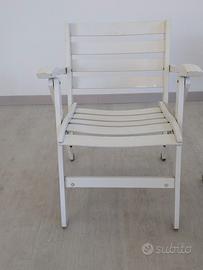 Set di 4 sedie bianche con poggia braccia, prodotte da Reguitti. Pieghevoli, realizzate in legno laccato bianco. Comode e pratiche. Perfetto per esterni. Piccoli difetti di usura.