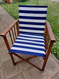 Set di 5 sedie da spiaggia pieghevoli tipo regista in legno e tessuto, anni 80 gia restaurate.