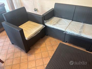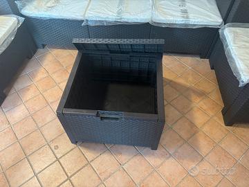 Il set è composto da un divano 3 posti,2 poltrone ed un tavolino contenitore(dentro è chiuso così non passa nè polvere nè nulla).