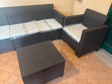 Il set è composto da un divano 3 posti,2 poltrone ed un tavolino contenitore(dentro è chiuso così non passa nè polvere nè nulla).