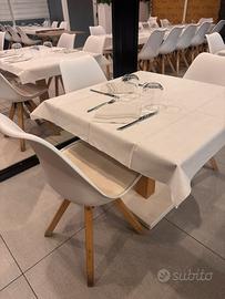 Vendesi set di arredo funzionale, ideale sia per attività di ristorazione che per casa. Tavoli da 80x80cm dotati di pratiche prolunghe e sistemi di aggancio che permettono di unirli creando tavolate continue per 4, 6, 8, 10 o anche 12 posti. Tavolo effetto legno resistente e facile da pulire. Sedia in polipropilene bianca con cuscinetto integrato, struttura a quattro gambe in legno stabili e moderne. Il materiale è in buone condizioni e pronto all’uso. Presenta solo lievi segni di usura dovuti all’utilizzo che non ne compromettono l’estetica. Vendibile lotto completo o diviso. Per visionare il tutto o chiedere info 345-7382549