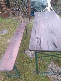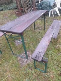 Il legno va in parte sostituito ma le parti metalliche sono in buonissime condizioni. Dimensioni tavolo: 59x170 h. 79. Dimensioni panche: 25x170 h. 47