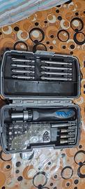 Vendo set chiave a cricco 53 pezzi in acciaio comprendente: 1 chiave a cricco, 3 set punte per chiave a bussola, 1 supporto magnetico per punte 60 mm e 48 punte. Ritiro a mano.