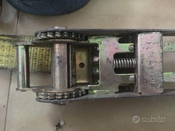 Vendesi n° 1 set completo di cinghia di ancoraggio con tenditore a cricchetto / cinghia di fissaggio con tenditore a cricchetto da 9,6 m avente carico di rottura come da foto (10.000 kg)+ un secondo set leggermente più piccolo. Il prezzo indicato è da intendersi per UN set.