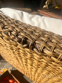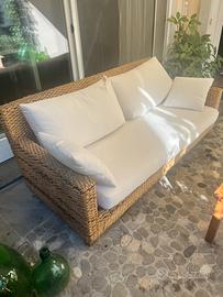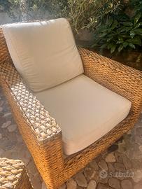 Vendo set da esterno composto da divano, 2 poltrone e un tavolino in legno massiccio e midollino. Il divano e le poltrone hanno i loro cuscini e gli schienali. Ho inoltre fatto fare ad una sarta un cambio federe color avorio.