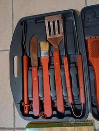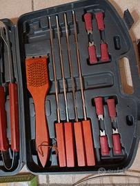 Set da barbecue: sei spiedini mai usati, quattro coltelli nuovi sempre imballati e altri accessori praticamente mai usati (vedi foto) riposti in apposita valigetta.