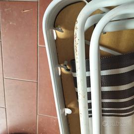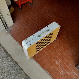 Set da campeggio pieghevole Vintage Anni 70 Tavolino+Sedie con valigetta Struttura interamente in alluminio leggero. Sedie in seduta con tessuto plastificato Set da campeggio vintage italiano pieghevole con valigetta. - 1 tavolo con disegnati gioco da tavola Dama - 4 sedie Peso 9 kg. Utlile per campeggio, picnic. Buono stato, piccole macchie di ruggine, come da foto.