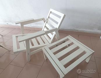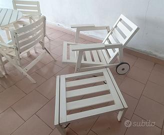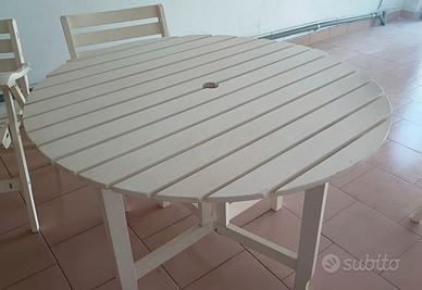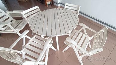 Vendo bellissimo set da giardino in legno verniciato bianco composto da: 1 tavolo rotondo, misure: diametro 102cm x altezza 72 cm 4 sedie pieghevoli 1 poltrona 1 tavolino, misura tavolino: 62 cm x 54 cm, altezza cm 30. Il set è in ottime condizioni, sempre tenuto al coperto. Struttura solida e stabile, ideale per terrazzo, balcone o giardino. Le sedie sono pieghevoli, quindi molto pratiche da riporre. Perfetto per pranzi all’aperto o momenti di relax. Condizioni: usato, in ottimo stato Ritiro: a mano