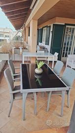 Bellissimo tavolo da pranzo in rattan sintetico con vetro fumè + 4 poltroncine con braccioli e cuscini marroni. Il bordo del tavolo presenta delle leggere imperfezioni causate dalla grandine ma riparate, cosi come una sedia (vedi foto). Sono comunque in ottime condizioni e stato.