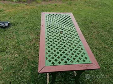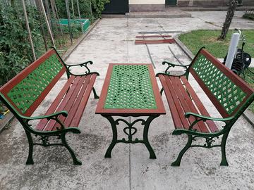 vendo set da giardino composto da due panche e e un tavolo, il tavolo ha una struttura in ghisa e e le aste da di legno, in tavola e appena grattato e riverniciato. il prezzo di vendita del set completo e 230 €, il prezzo del nuovo e di circa 380_400 € visionabile su Internet, quindi avete il 40 percento di risparmio ed il set e stato rimesso a nuovo.