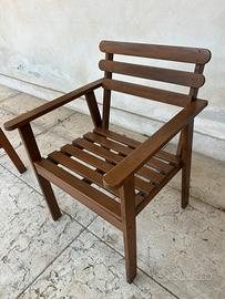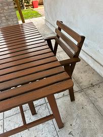 Vendesi bellissimo set da esterno in legno massello color noce/marrone scuro, perfetto per giardini, terrazzi o porticati. Il set è caratterizzato da un design a doghe classico e senza tempo.
