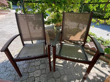 tavolo pieghevole 120x70 n. 2 sedie non pieghevoli con braccioli; struttura in teak; schienale e seduta in robusto tessuto da esterni
