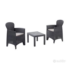 Goditi le migliori giornate di sole dal tuo giardino o terrazza con i nostri set che trasformeranno il tuo esterno in uno spazio dove puoi mangiare e rilassarti con la famiglia o gli amici. Varie Composizioni con sedie/poltrone e da un tavolo o un comodo divano doppio in polipropilene ad alta densità con finiture in finto rattan e cuscini in textilene rimovibili per una facile pulizia.