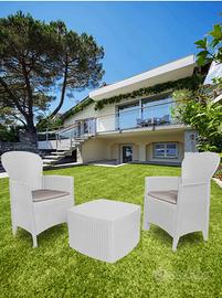 Elegante set da esterno made in italy, formato da due poltrone con cuscini e un tavolino quadrato contenitore - perfetto per arredare il proprio spazio outdoor con un unico acquisto, grazie alla composizione intrecciata con effetto rattan che ne accresce la modernità e lo stile