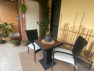 Vendesi set completo di tavolino più sedie da giardino/terrazzo. Materiale polyrattan colore nero e tavolino in legno. Consegna a mano.