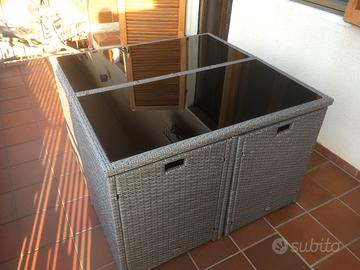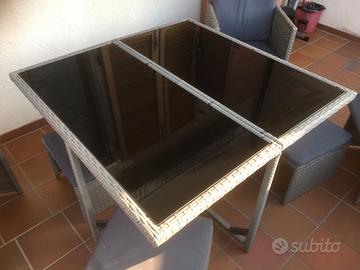 Set da giardino OUTSUNNY in rattan, struttura in acciaio, piano in cristallo nero lucido, cm. 110x110x72. 4 poltroncine con cuscini, cm. 52x52x86. 4 poggiapiedi con cuscini, cm. 42x42x32. Richiudibili sotto il tavolo. Usato 1 stagione.