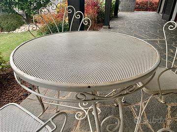 Set da giardino, anni 60/70 realizzato in ferro battuto verniciato, tavolo tondo con quattro poltroncine con braccioli struttura in buone condizioni, verniciatura originale con piccoli segni del tempo! Sempre tenuto al coperto Tavolo L76 H70 Poltroncina larghezza seduta 35x35 Consegna a mano zona Dairago (Mi)