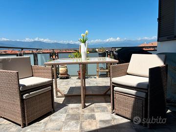 Vendesi set da giardino Vabo 8 color beige, acquistato nel 2023, montato e utilizzato una sola volta. Il set è realizzato in acciaio zincato rivestito con vernice a polvere e resina intrecciata. Il set può ospitare fino a 8 persone a tavola. Composto da tavolo con piano in vetro temperato beige, spessore di 5 mm, n. 4 poltrone e n. 4 poggiapiedi. Quando i poggiapiedi non vengono utilizzati, possono essere riposti sotto le poltrone, che a loro volta si sistemano sotto il tavolo e il tavolo rimane sempre in ordine. Dotato di cuscini spessi 5,5 cm, sono sfoderabili e resistenti all'acqua. I braccioli e gli schienali delle poltrone sono larghi 2,5 cm. Per spostare e riporre facilmente le sedie, ogni schienale è dotato di una maniglia.