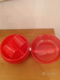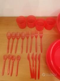 Set da Pic-nic in plastica per 4 persone, colore arancione. Il set comprende 2 ciotole per insalatiera, 4 bicchieri, 4 piatti fondi, 4 piatti piani, 4 piatti per dolce, 4 cucchiai, 4 forchette, 4 coltelli, 4 cucchiaini. Nuovo mai usato.